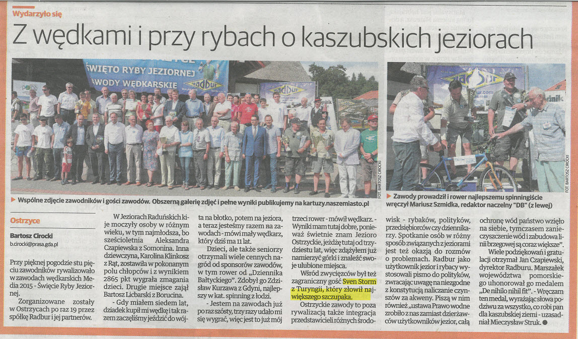 Am dortigen 330 ha großen Ostrzyckie See verbringe ich viel Zeit der Angelfischerei zu fröhnen. Diesen Sommer begleitete uns auch mal wieder mein Freund und Vereinskollege Herbert Ronis. Mein “alter Jan” (88 Jahre) liegt mir nun schon einige Jahre in den Ohren, ich solle doch mal am - jeweils vorletzten Augustwochenende stattfindenden - Fischereiwettbewerb teilnehmen. Da es dieses Jahr “terminlich” passte, wurden Herbert und ich von Jan - einfach angemeldet.